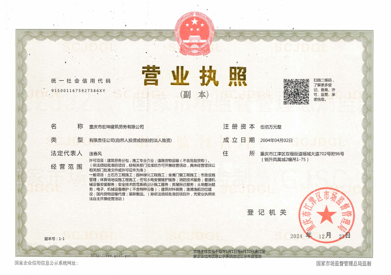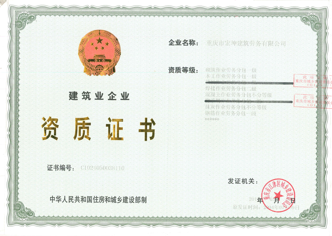 重慶市宏坤建筑勞務有限公司專業從事砌筑、木制、抹灰、鋼筋、混凝土、腳手架、模板、焊接等建筑勞務作業,兼營建筑建材、建筑裝飾材料銷售。